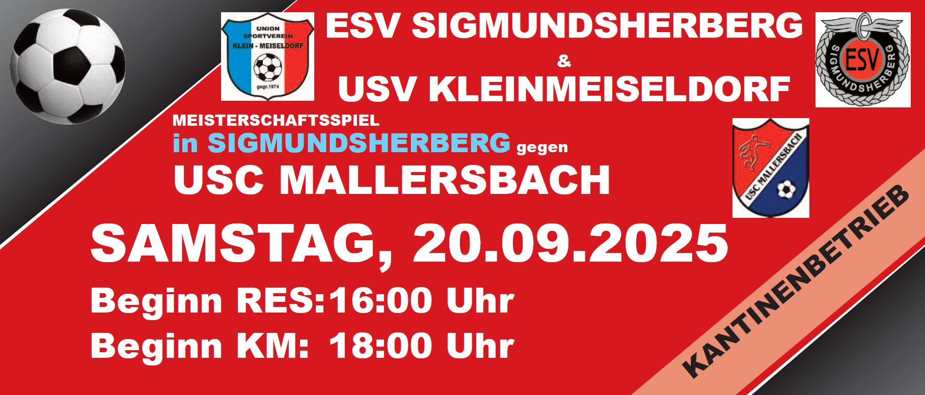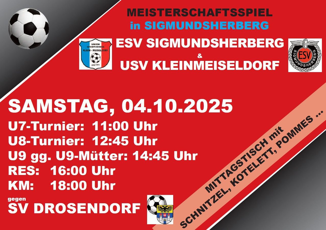 Weiter geht es für die SG ESV/USV mit einem Heimspiel in Sigmundsherberg gegen den USC Mallesbach. Mit weiter ansteigender Form, sollte hier diesmal etwas Zählbares herausschauen: Samstag, 20.09.2025, 16:00 / 18:00 Uhr. Wir starten aber schon am Vormittag, 10:00 Uhr, mit einem Spiel unserer U9 gegen St.Bernhard.
