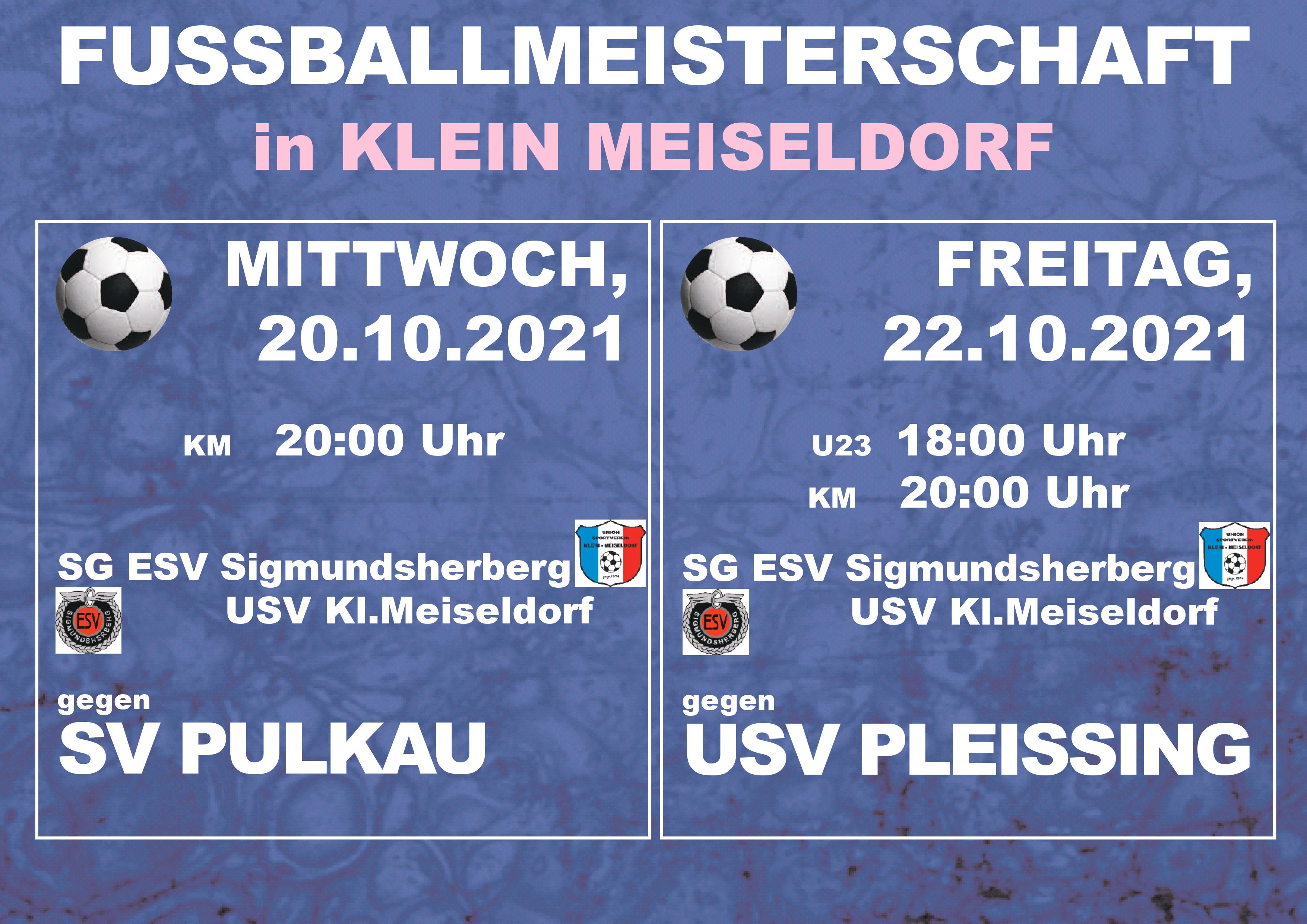 Weiter geht es für die Kampfmannschaft schon am Mittwoch, 20.10.2021, 20:00 Uhr mit dem Nachtragsspiel gegen Pulkau - gespielt wird in Klein Meiseldorf (die U23 Partie findet am 13.11.2021, 14:00 Uhr in Sigmundsherberg statt).