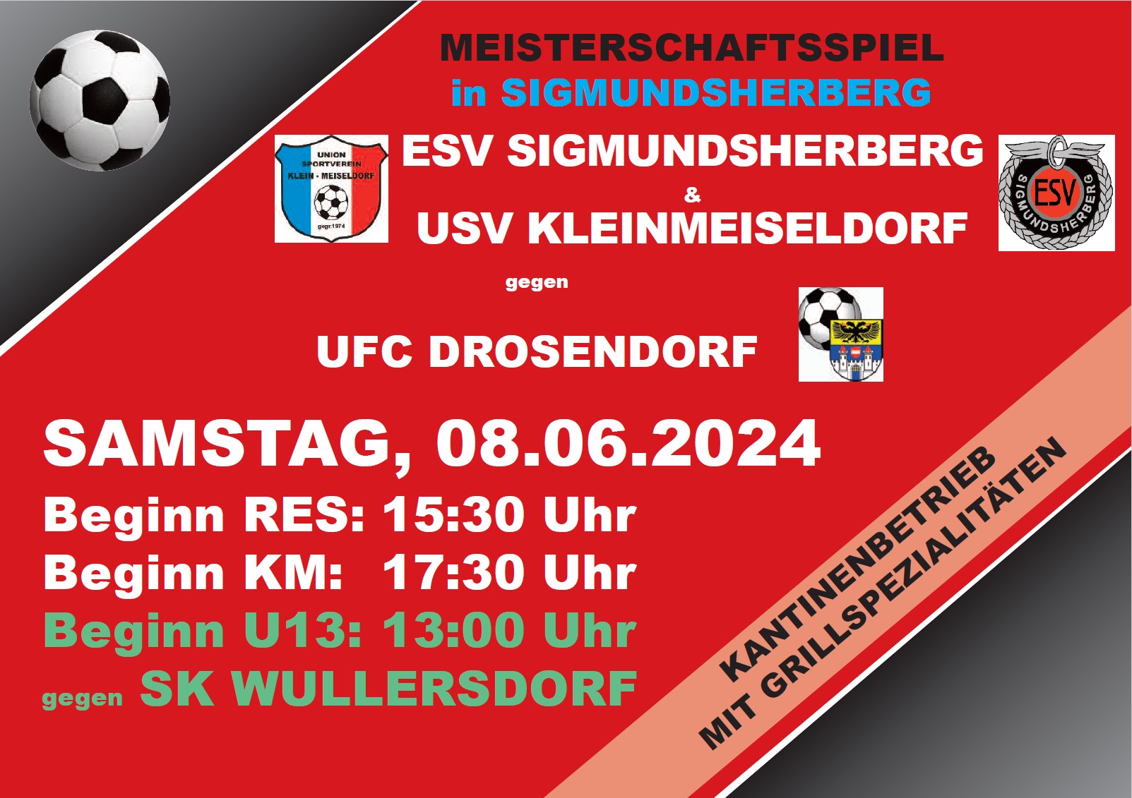 Die letzte Runde für alle Teams geht in Sigmundsherberg am Samstag, 08.06.2024 über die Bühne. Die U13 startet um 13:00 Uhr gegen Wullersdorf. Die Reserve folgt um 15:30 Uhr und die Kampfmannschaft um 17:30 Uhr - jeweils gegen Drosendorf.