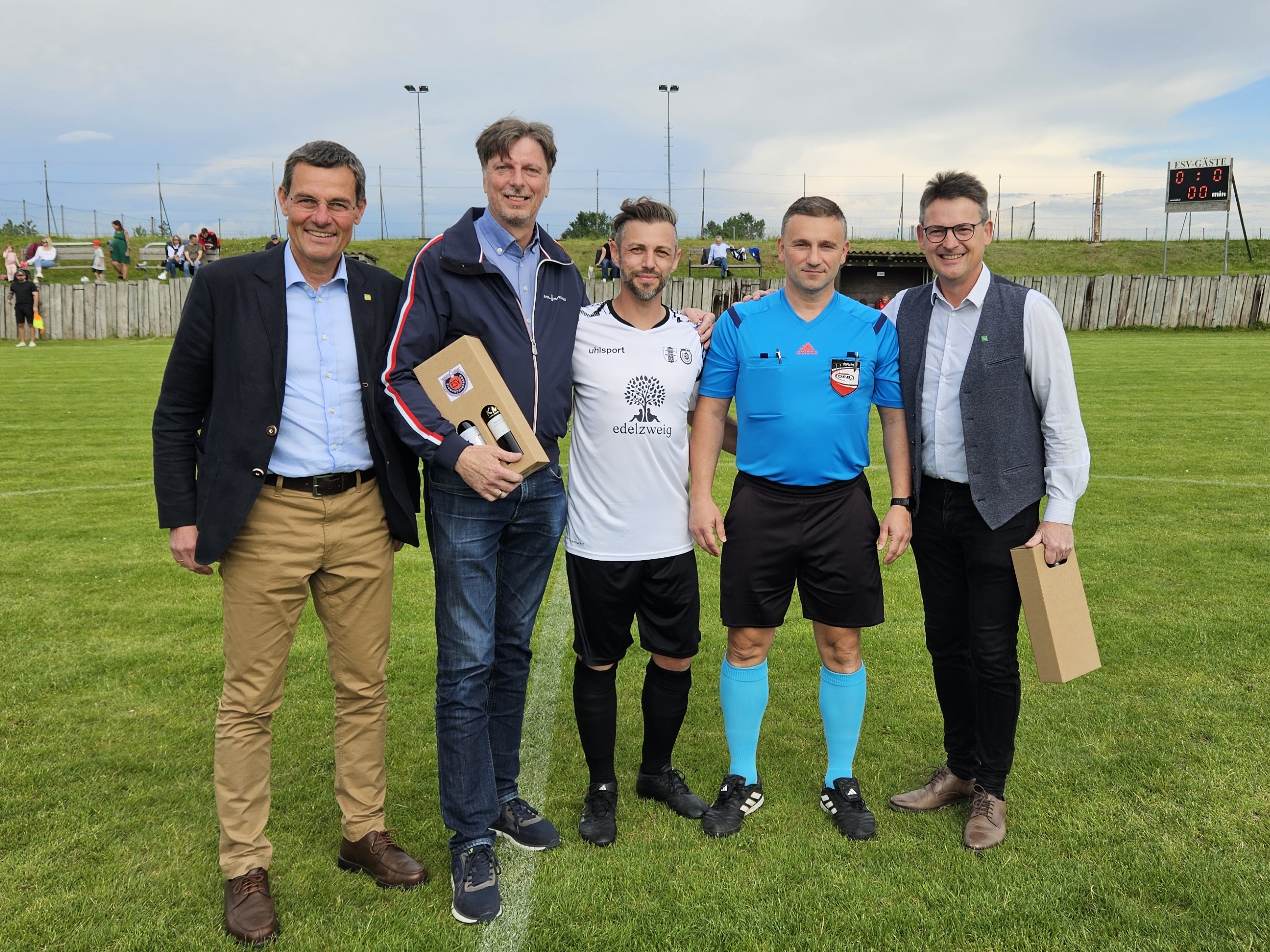 Herzlichen Dank an Landtagsabgeordneten Franz Linsbauer für die Patronanzübernahme und Bürgermeister Franz Göd für die Ballspende beim Heimspiel gegen den SVU Langau. Auch Bezirkshauptmann Mag. Stefan Grusch ließ es sich nicht nehmen uns zu diesem Anlass zu besuchen. Hier im Bild nach erfolgreichem Ankick mit unserem Kapitän Michael Schmudermayer und Schiedsrichter Ing. Sulejmanovic Hasan.