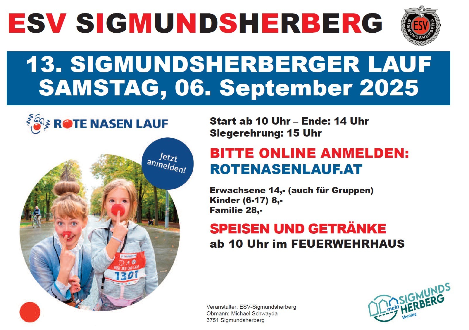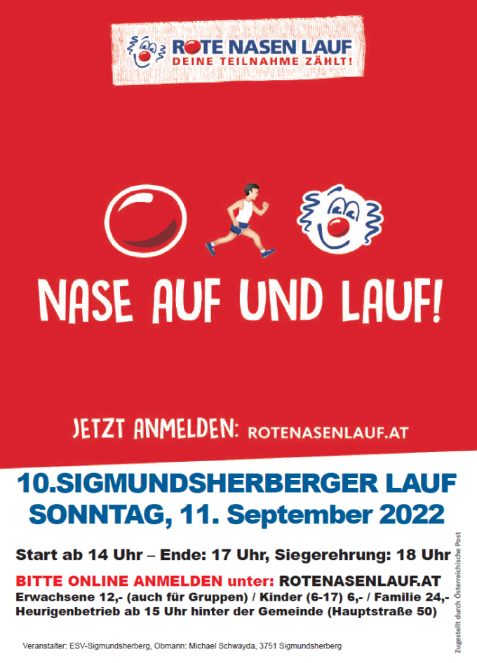 Der ESV Sigmundsherberg veranstaltet nun schon den 12. Rote-Nasen-Lauf in Sigmundsherberg. Es gilt wieder die Gartenstadtrunde möglichst oft für den guten Zweck zu bezwingen. Anmeldungen bitte online gleich hier!